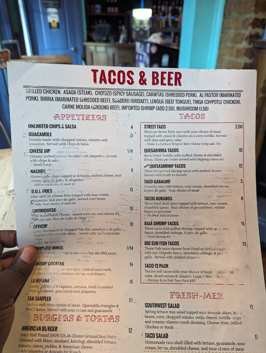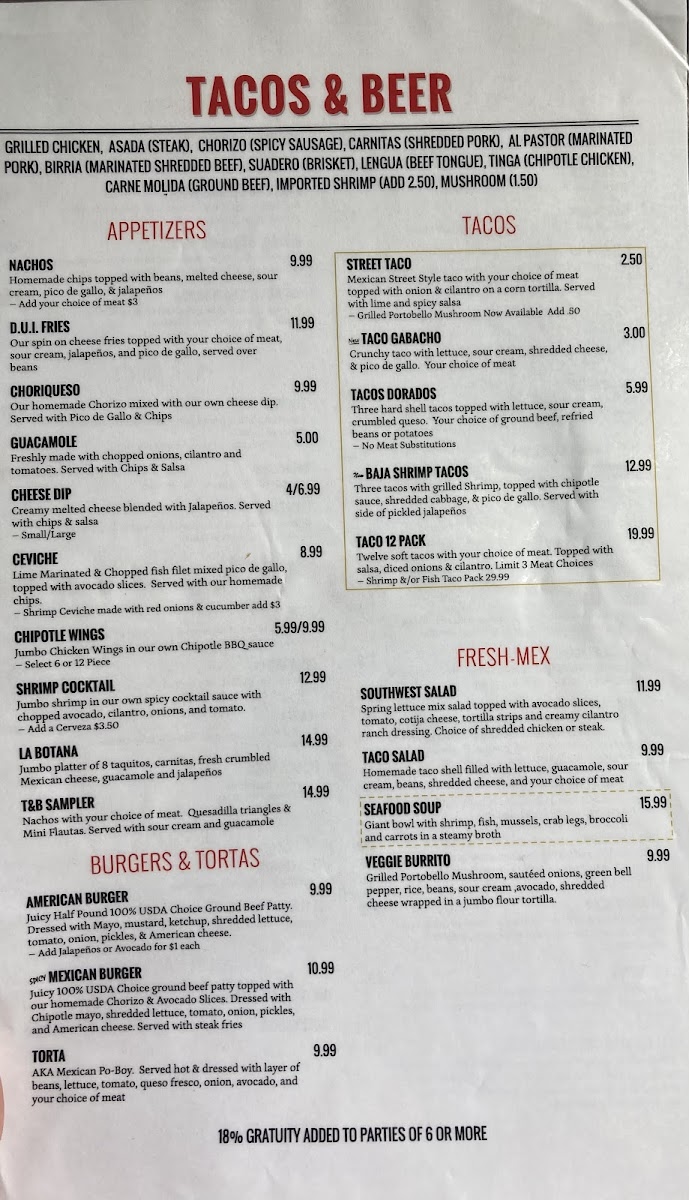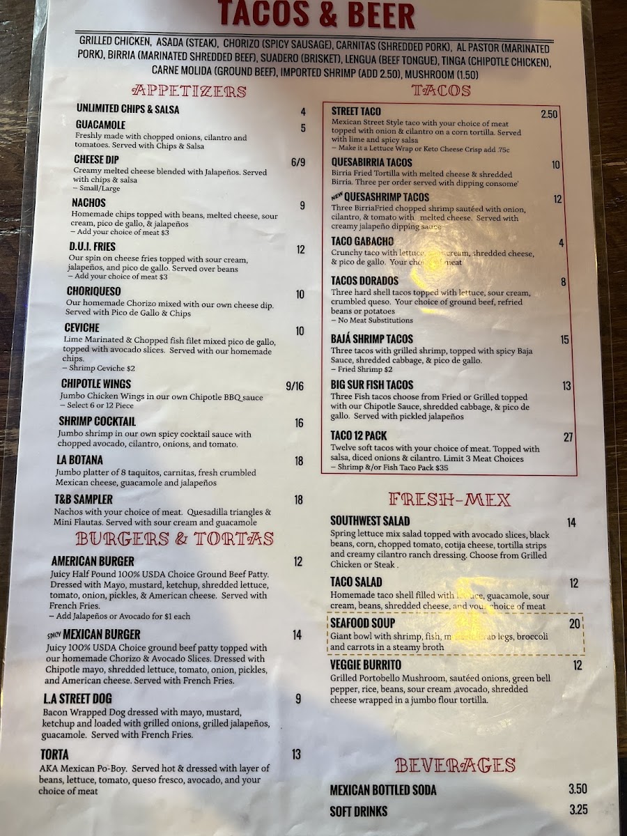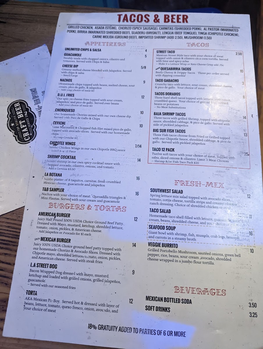 The menu at Tacos & Beer offers a straightforward, casual dining experience centered on comforting Mexican flavors and easygoing bites. It’s the kind of place where the focus is on well-prepared street tacos, classic plates, and refreshing drinks that fit naturally into lively yet relaxed gatherings.
