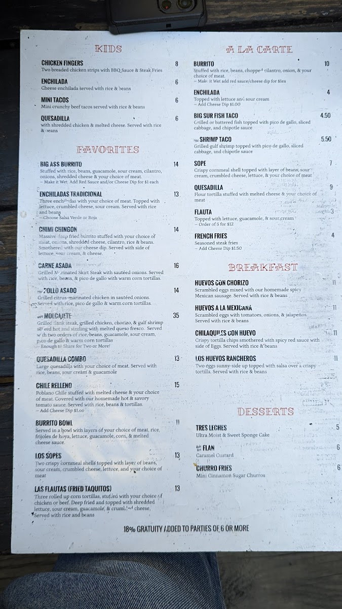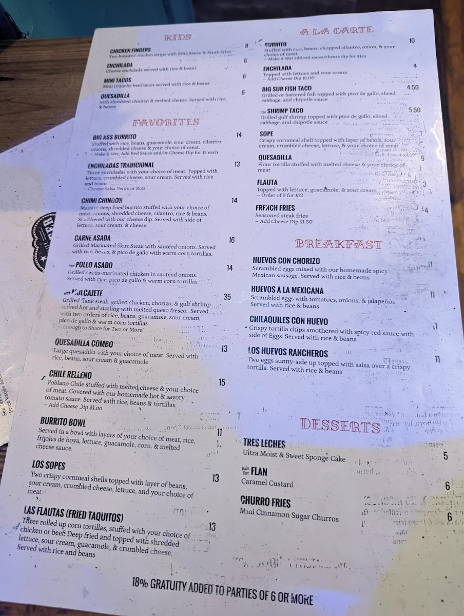 Drinks complement the casual vibe, with cold beers such as Modelo Especial and Corona offering familiar refreshment. Specialty cocktails, including frozen margaritas and the Mango Margarita in shareable 64oz servings, add a festive touch perfect for unwinding with friends or family around the table.